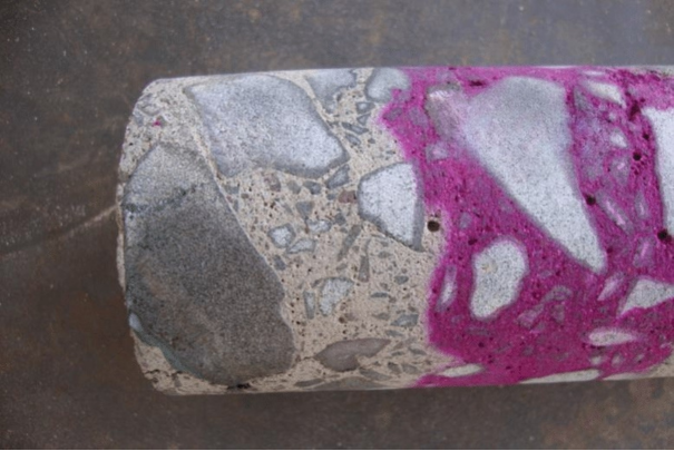 A small freshly exposed surface of concrete is prepared using drilling or breaking.